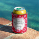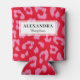 Célébrez la future mariée et ses derniers jours de liberté avec des refroidisseurs de canettes personnalisés amusants et flirtants qui présentent un motif de taches d'impression de léopard en rouge et rose girly et un texte de nom et de titre personnalisé de l'autre côté. La typographie chic est facile à personnaliser avec les détails de votre événement et à personnaliser pour chaque invité en tant que cadeau de bienvenue ou faveur de fête.