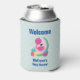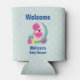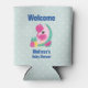 Bienvenue, événement personnalisé, peut cozie. Conçu avec une jolie illustration d'un flamant rose avec quelques pastèques et ananas. Couleurs rose et vert. L'été et tropical. L'arrière - plan est de couleur vert pâle avec des pois blancs.