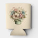 Un protège-canette avec une image mignonne. Fleurs bleues, roses et crème avec des feuilles vertes. Ensemble dans un pot de fleurs vert avec un tissu à carreaux vert suspendu sur le côté.