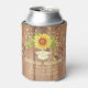 Un élégant tournesol jaune rustique Graduation peut et glacière bouteille comprenant un arrière - plan en bois marron décoré d'une jolie tournesol jaune aquarelle fleurie avec une abeille et des lampes à cordes. Fait un cadeau de félicitations unique / garde-robe pour un diplômé. Personnalisé avec le nom du diplômé, l'année et l'université pour en faire un cadeau unique de félicitations de diplôme