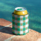 Adorable, whimsical green and white gingham pattern can cooler with cute yellow sunflowers with happy faces in each of the light green squares.