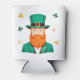 Leprechaun Clover Shamrock Patrick's Day Can Cooler. Un festif thème de la Saint-Patrick peut refroidir avec l’illustration d’un homme joyeux. L'homme porte un casquette vert avec une bande noire et une boucle d'or et a une barbe rouge vif. Son visage a une expression amicale avec un sourire. La glacière est entourée de shamrocks verts et oranges.