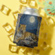 Leopard themed can cooler. On the front is an illustration of a majestic leopard with fur like molten gold, laying on a cliff ledge bathed in ethereal moonlight. Intricate carvings adorn crumbling stone pillars, and bioluminescent flora casts a soft, otherworldly glow. The scene is rendered in a rich, textural oil painting style with thick strokes.