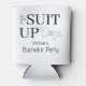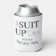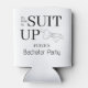 Canettes de bière personnalisées pour enterrement de vie de garçon en noir et blanc. Design moderne personnalisé avec un nom et comportant une illustration minimale de nœud papillon avec la citation amusante "il est temps de se mettre en tenue".