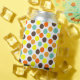 Cette boîte de refroidissement a une conception géométrique de points bleus, orange, jaunes et marron.