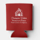This professional realtor can cooler is custom made with your real estate company name under the modern cursive script for an open house. These bold custom red realty business promotional items feature a house logo image for home builder or realty agent company marketing.