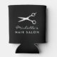 Refroidisseur de boisson personnalisé avec le nom du salon de coiffure pour coiffeur. Élégant support de boisson noir et blanc avec logo de ciseaux de coiffeur. Couleur de fond personnalisable. Impression double face. Ajoutez votre nom personnalisé, nom d'entreprise, slogan de l'entreprise, etc. Idée de cadeau mignon pour les employés, clients, clients, amis, famille, personnel, etc.