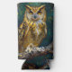 A beautiful personalized can cooler with a gold and blue owl sitting on a tree branch. This illustration has an impasto oil painting style.