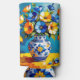 Beautiful can cooler with a beautiful impasto style ai illustration of blue and orange flowers in a fancy vase.
