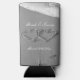 Coeurs dessinés sur la plage et mariage personnalisé Seltzer Can Cooler. Conception personnalisée avec nom de la mariée et du marié plus date du mariage. Sable de plage et eau de mer photo. Image en noir et blanc. Élégant modèle de typographie de script. Modèle classe pour les couples qui se marient. Parfait pour la fête d'été, la réception et plus encore.