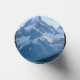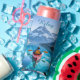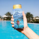 Can cooler with an illustration of a man kayaking in the ocean by the snow topped mountains. Pretty serene blue tranquil water and pine trees surround him on a peaceful journey.