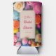 Beautiful and colorful tulips, roses and hydrangeas highlight this text box framed bridal shower seltzer can cooler.