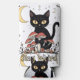 Whimsical noir cat framed by red mushrooms and pale flowers under a crescent moon; bold, hand‑drawn style ideal for quirky animal lovers and night‑owl fashion fans.