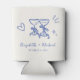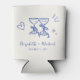 Romantic light cream wedding can cooler featuring whimsical hand-drawn french blue illustrations of a heart, stars and wine glasses and the names of the bride and groom showcased in a playful blue script.