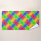 Cette serviette de bain colorée présente un motif arc-en-ciel en spirale abstrait tourbillonnant dans les couleurs vert, bleu, jaune, orange et rouge.