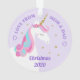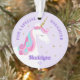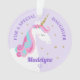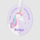 Ce ornement personnalisé de licorne fille présente un design de licorne lunatique mignon avec des fleurs et des étoiles de parties scintillant en faux or. Personnalisez le texte à l'avant et à l'arrière.