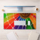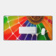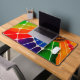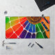 Ce tapis de bureau a une toile arc-en-ciel dessus.