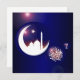 Silhouette of a mosque and star in a crescent moon, Allah calligraphy, and fanous in blue 3-d circles on a dark blue background.