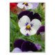 Une photographie numérique mignonne comportant une rangée verticale de quatre pensées, chaque un ton et une nuance différents de pourpre avec un peu de géranium rouge brouillé à l'arrière-plan.