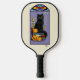 Un chat noir assis sur un tas de livres à la bougie rouge, des citrouilles, des susans aux yeux noirs et un papillon en verre taché sur un fond de violet et de jaune clair.