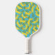 Cette pagaie personnalisée de pickleball (disons que trois fois plus vite !) est constituée de bananes. Sur le devant est l'illustration d'un mignon chien de style dachshund fait de bananes jaunes. Il y a un endroit pour ajouter un nom sous le graphique. À l'envers, un motif de coordination de chiens de bananes avec des feuilles de palmiers tropicaux verts contre un arrière - plan bleu vif.