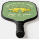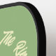 Raquette de pickleball amusante à personnaliser pour un enterrement de vie de jeune fille ou de garçon en week-end pickleball ou pour des festivités et activités de mariage - voici une raquette de pickleball sauge et crème avec des cloches de mariage dorées à personnaliser avec le nom ou les initiales du couple et la date du mariage. Au-dessus des cloches de mariage se trouve la phrase dernier swing avant l'anneau. En dessous des cloches de mariage se trouvent les initiales et la date du mariage que vous pouvez personnaliser. Personnalisez et faites personnaliser une raquette de pickleball pour vous-même ou pour votre joueur de pickleball préféré qui se marie. Le dos de la raquette de pickleball est une silhouette de mariée et de marié tenant des raquettes de pickleball et frappant une balle de pickleball sauge sur fond crème. Remplacez par votre propre image si vous le souhaitez.