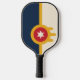 Pickleball Paddle avec un design avec le drapeau de Tulsa, Oklahoma. Un drapeau beige et bleu marine avec un bouclier or Osage contenant un cercle rouge et une étoile beige à six branches