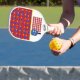 Graphique de pickleball rouge, blanc et bleu pour un tournoi de pickleball de la fête de l'Indépendance, ou la fête du pickleball du 4 juillet. Pagaie de pickleball bleu avec étoiles blanches sur un arrière - plan rouge parsemé de pickleballs jaunes. La moitié inférieure de la pagaie est ornée d'un drapeau américain constitué d'une pagaie bleue avec des étoiles blanches et des bandes rouges de pickleball sur le blanc. Pagaie de pickleball coloré pour un 4 juillet repas, cadeau d'anniversaire d'été pour votre mère patriotique amoureuse du pickleball, papa, oncle, tante, frère, soeur, voisin, grand-père, grand-mère, mari, femme, ami ou collègue de travail qui n'arrêtera pas de parler du pickleball.