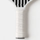 Elegant Modern Black and White Stripes Pink Script Monogram Pickleball Paddle. An elegant Pink script monogram combined with a clean white san-serif font makes for a contemporary look.