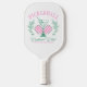 Cette pagaie à pickleball a une image d'art en ligne rose et verte de pagaies à pickleball et un verre à martini entouré de branches de laurier avec l'expression "Pickleball Cocktail Club, Please Dink Responbly". Les couleurs utilisées sont le vert et le rose. Le dos a des rayures roses et blanches qui se coordonnent avec la conception sur l'avant.