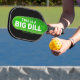 Pagaie personnalisée personnalisée à imprimé noir et vert unique et amusant avec une énorme photo d'illustration de pickle surdimensionnée et "This is a Big Dill" drôle de pickleball cotte citation, un dicton parfait un design différent qui attirera l'attention sur le terrain, et votre nom et numéro de téléphone coordonnées est imprimé directement sur elle afin que vous ne perdiez pas votre place ou votre pagaie.