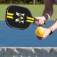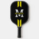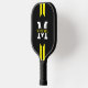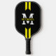 Pagaie de pickleball masculin personnalisée avec un arrière - plan noir, 2 rayures de course jaunes, votre initiale, et le nom.