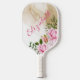 Un feuille rose fleuri et vert, avec un design arrière - plan en marbre tourbillon d'or sur cette pagaie de pickleball. Monogramme/ personnalisez-le avec votre nom ou vos initiales ou tout texte. Un cadeau branché pour le joueur de pickleball !