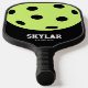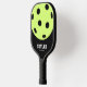 Paddle personnalisé unique et amusant imprimé personnalisé avec un grand nombre d'icônes de boule de pickleball jaune néon brillant design avec votre nom dans une police classique sportive et numéro de téléphone ou de contact optionnel en petit texte.