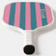 Des rayures roses et bleues sont sur cette pagaie à pickleball. En haut, il y a le texte d'affichage que vous pouvez modifier pour afficher le nom du destinataire. Cette pagaie à pickleball a une palette de couleurs rétro 'style les années 70 qui comprend le rose et bleu muet.