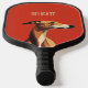 Il s'agit d'un design minimaliste de pagaie à pickleball avec une illustration de couleur grisâtre brune contre un arrière - plan rouge vif et un texte personnalisable "délicat".