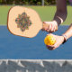 My friend just built a house with a pickleball court in it, and I just had to design a special paddle. This one features a caramel-colored geometric mandala with touches of blue and yellow. I hope that this mightily improves your game!