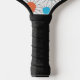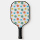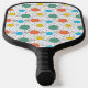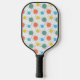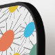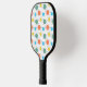 Cette pagaie à pickleball a un design moderne du milieu du siècle avec des lignes derrière orange, jaune, turquoise et vert.
