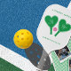 Célébrez votre amour l'un pour l'autre et votre amour pour le pickleball avec cette raquette de pickleball personnalisée. L'avant de la raquette présente des illustrations de raquettes de pickleball en forme de cœur vert et d'un pickleball rose. Elle est prête à être personnalisée avec votre propre titre. Vos initiales sur les raquettes et vos noms en dessous. Le dos de la raquette comporte des emplacements pour ajouter deux de vos photos avec des légendes personnalisées. Vos photos sont placées sur un fond à carreaux vert et blanc.