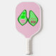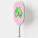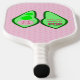 Cette superbe Pickleball Paddle présente une image graphique d'un pod de pois vert contenant 2 pois verts et un gros pois rose. Le grand pois rose a un petit visage mignon avec les yeux et une bouche. De l'autre côté de la pod de pois en texte rose foncé il dit "Baby Girl Ready to Pop". Le design est idéal pour une faire-part de grossesse, la révélation de genre ou le baby shower. Il y a un groupe de petits pois roses dans l'arrière - plan.