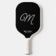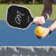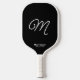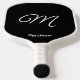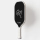 Pagaie de pickleball noir et blanc avec un script d'écriture mignon et simple monogramme initial, et nom personnalisé et numéro de téléphone en option dans un design simple, subtil, classique-moderne tendance avec un look féminin girly.