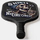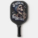 Un squelette portant un bandana sur la tête avec les mots que personne ne s'en soucie, impliquant une nature secrète. La posture des squelettes suggère une aura mystérieuse et furtive, car elle reste silencieuse et cachée des regards indiscrets. 1. Présentant le "shhh no care Pickleball paddle", une pièce unique et captivante qui allie style et touche de mystère.