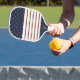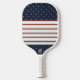 Un motif simple rayé aux accents de pois. Cette pagaie de Pickleball présente une ligne rouge audacieuse avec une ligne verte plus fine, de chaque côté. Cette combinaison alterne avec une règle noire de cheveux et une bande blanche épaisse. En haut et en bas de ce design il y a un bloc de marine, avec des points dorés.