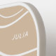 Pagaie personnalisée minimaliste et moderne avec personnalisation transparente intégrant votre nom dans le design. La pagaie présente un design de vague organique superposé sur de belles teintes neutres disponibles en terre cuite, rose roux, chameau, sable, rose poussiéreux, lavande, vert mousse, vert sauge, bleu gris et bleu ardoise. Idée cadeau idéal pour les joueurs de pickleball nouveaux et chevronnés qui aiment le luxe tranquille et le style sobre.
