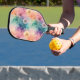 Vintage dandelion abstract pattern pickleball paddle featuring delicate seed heads layered over rich teal, pink, and muted purple watercolor textures. Dreamy and artistic with an ethereal mixed-media aesthetic, this seamless design is ideal for botanical art lovers, boho style fans, nature enthusiasts, and vintage-inspired decor admirers.