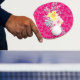ピンクの背景にハイビスカスの柄、裏面には元気が出るようにSmaile!のロゴをデザインしました。