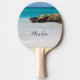 Pagaie de ping-pong personnalisée avec une belle photo. Une plage de sable blanc, au surf doux. Une eau tropicale turquoise entoure un rocher déchiqueté.