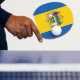 Ping pong paddle avec drapeau de la ville de Philadelphie, Pennsylvanie; drapeau avec trois bandes verticales de bleu et jaune avec armoiries de la ville au centre