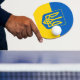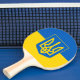 Ping pong paddle avec le drapeau de l'Ukraine, un drapeau bleu et jaune avec les armoiries ukrainiennes (emblème) avec un trident au centre