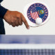 Insigne de l'Idaho avec le drapeau de l'Idaho et le drapeau des couleurs des USA, forme arrondie. Emblème de l'Idaho. Sceau de l'Idaho. Collection USA Etats.